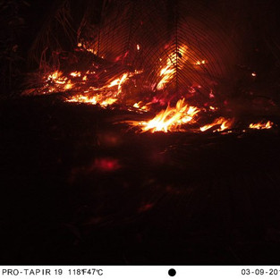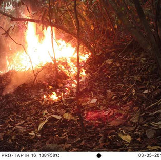 As armadilhas fotográficas, que são câmeras com um sensor de movimento, foram instaladas na RBS pela equipe do Pró-Tapir, para estudar as atividades de diversos mamíferos, incluindo, claro, a anta. Essas armadilhas ficam em funcionamento 24 horas por dia, durante pelo menos um mês, até decidirmos movê-la para outra área ou retirá-la daquele local. Nossas câmeras estavam funcionando por duas semanas quando o incêndio iniciou. No dia seguinte, parte da equipe foi ao local, conseguindo retirar oito delas, porém o restante continuou na mata. Por estarem nas áreas onde o fogo consumiu parte da RBS, pensávamos que iríamos perdê-las, mas para a nossa surpresa (e alívio!), quando retornamos, na segunda semana de abril de 2016, elas ainda estavam lá.